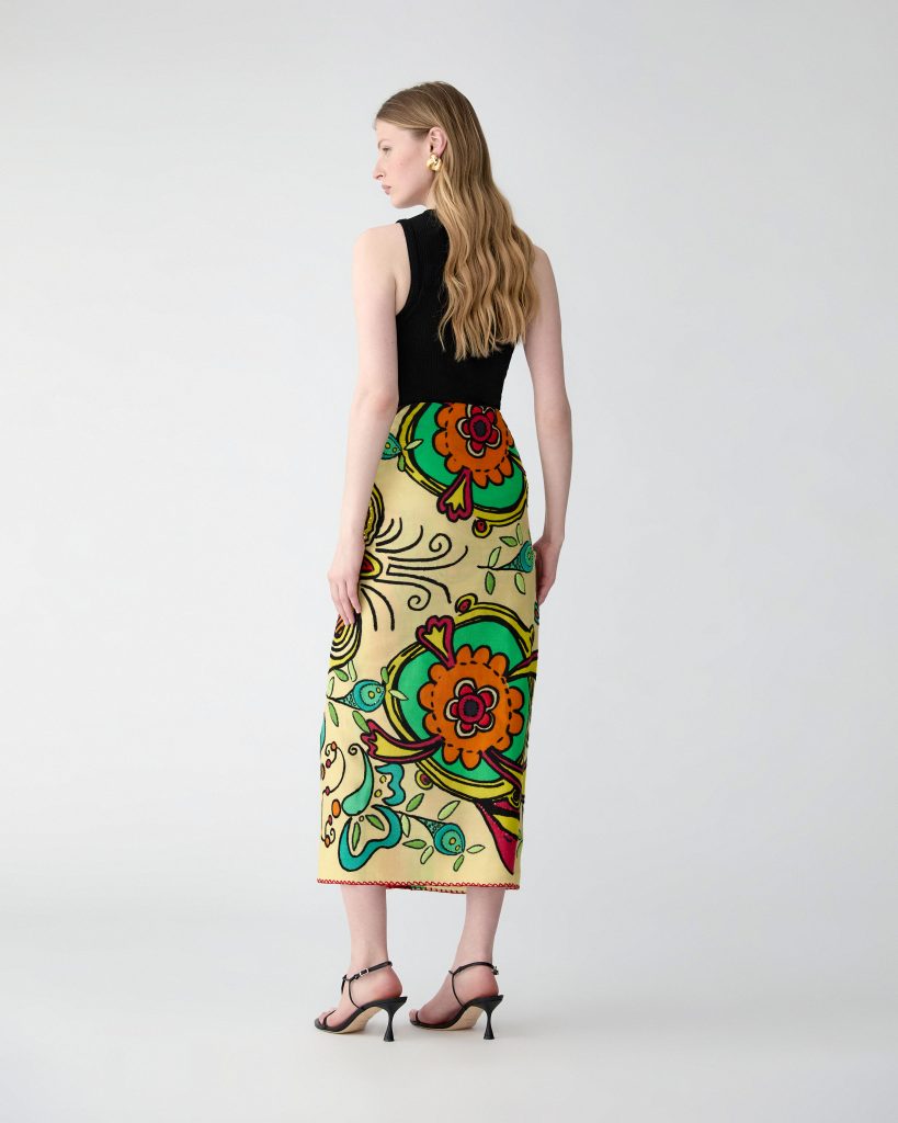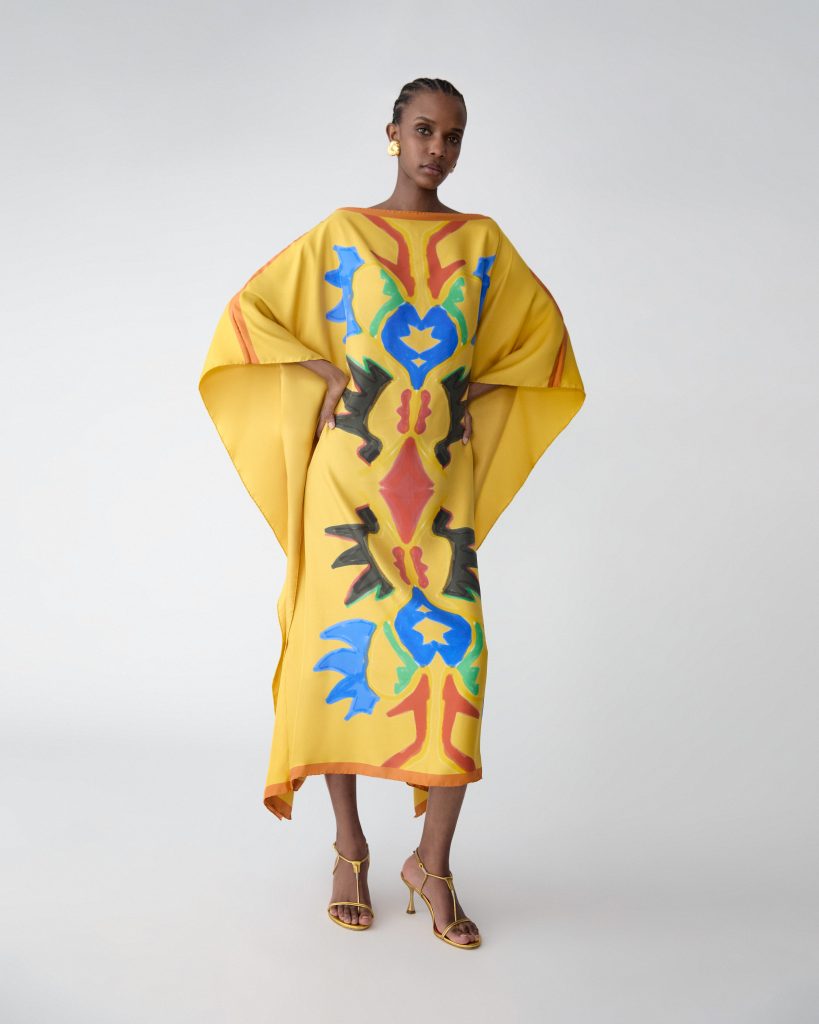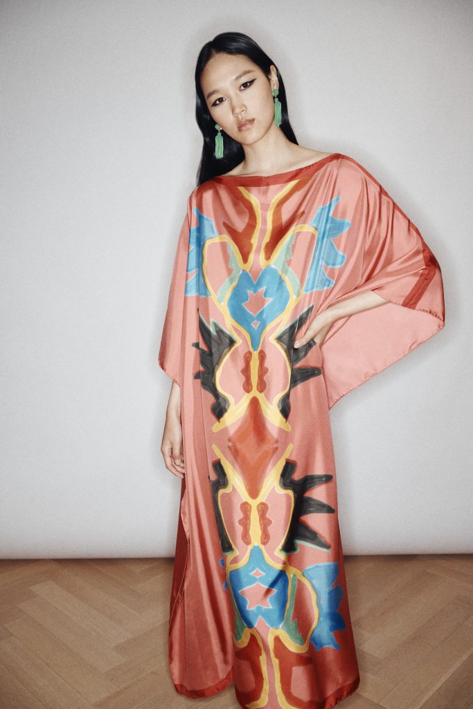Im Zentrum steht ein Kaftan aus Seide, der klassische Motive aufgreift und sie in eine zeitgenössische Form überführt. Die fließende Silhouette, der tiefe Ausschnitt und die Leichtigkeit des Materials erzeugen eine Präsenz, die weniger laut als selbstverständlich wirkt. Farben scheinen sich über die Oberfläche zu bewegen, Muster entwickeln eine fast malerische Qualität, ohne je ins Dekorative zu kippen. Das Kleidungsstück funktioniert dabei nicht als Statement im klassischen Sinn, sondern als eine Art Haltung – selbstbewusst, aber nicht inszeniert. Ergänzt wird diese Idee durch ein Tuch, das sich bewusst jeder eindeutigen Funktion entzieht. Gefertigt aus leichter Wolle und mit feinen Stickereien versehen, eröffnet es verschiedene Möglichkeiten des Tragens: als Stola, als Rock, als Kleid. Es geht weniger um Transformation als um Freiheit im Umgang mit dem eigenen Stil. Die Beweglichkeit des Materials wird zum gestalterischen Element, das sich immer wieder neu interpretieren lässt.