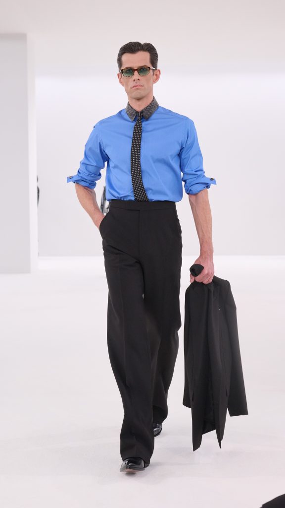 Unter der kreativen Leitung von Haider Ackermann entwickelte das Haus eine Kollektion, die sich ganz auf die Spannung zwischen Präzision und Verführung konzentriert. Im Zentrum stand der archetypische Tom-Ford-Anzug – ein Kleidungsstück, das seit Jahrzehnten für Macht, Eleganz und Selbstbewusstsein steht. Ackermann nahm diesen Klassiker und verschob ihn nur minimal. Revers wurden länger, Hosen leicht ausgestellt, Schultern scharf gezeichnet. Es sind kleine Veränderungen, die große Wirkung haben. Die Silhouetten wirken vertraut und gleichzeitig neu, als hätte jemand die Regeln der klassischen Schneiderkunst leise neu geschrieben.