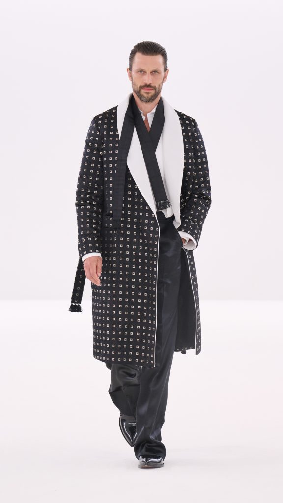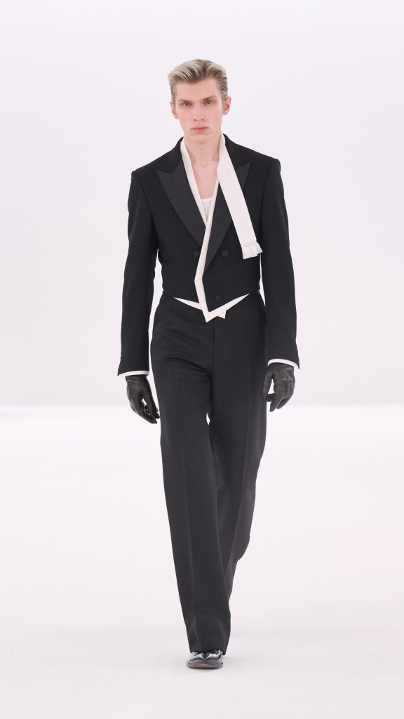 Gerade diese Gegensätze gaben der Kollektion ihre Energie. Weiche Materialien trafen auf harte Oberflächen, strenge Linien auf subtile Sinnlichkeit. Manche Looks wirkten bewusst leicht zerknittert – als hätten sie bereits ein Kapitel Nachtleben hinter sich. Ein Smoking mit minimal gelockerter Silhouette, ein Mantel, der über einem transparenten Hemd getragen wird, ein Lederrock mit spiegelnder Oberfläche. Es sind Kleidungsstücke, die Eleganz nicht als Distanz verstehen, sondern als eine Form von Selbstbewusstsein.