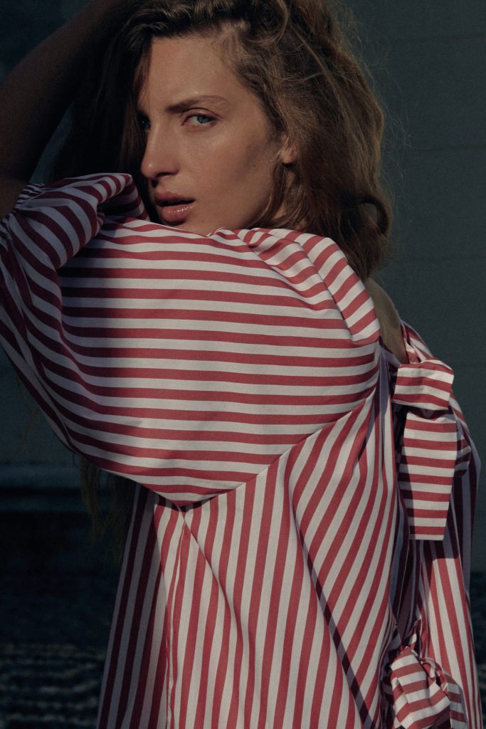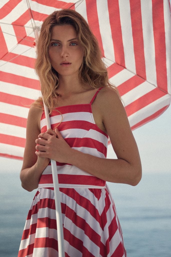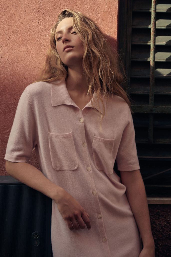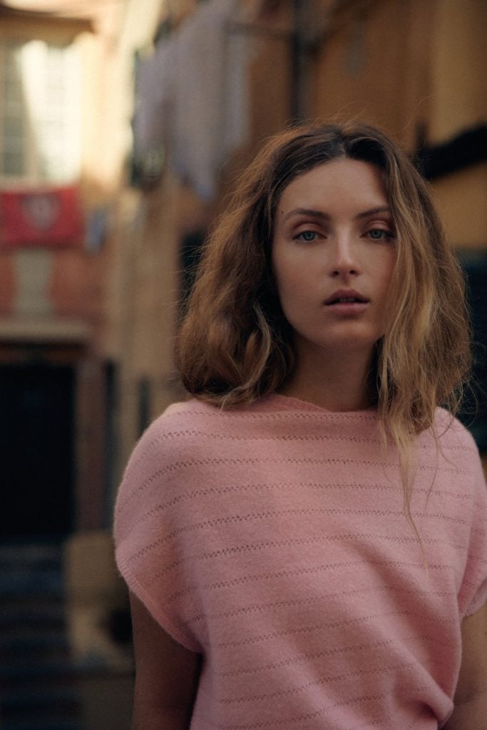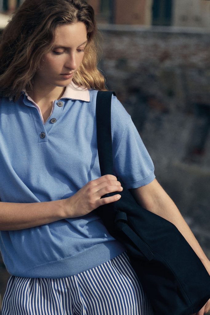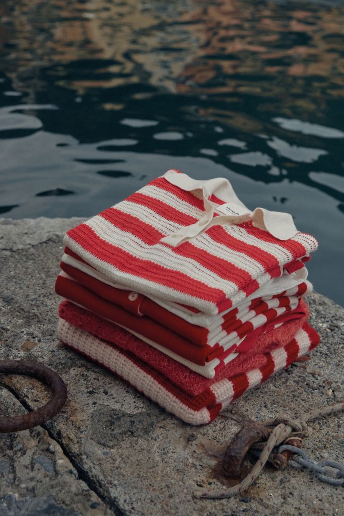 Die neue Sommerkollektion interpretiert klassische Riviera-Codes mit moderner Klarheit. Rot-weiße Streifen erscheinen in präzisen Strickstrukturen und erinnern an maritime Sommerbilder vergangener Jahrzehnte – an Sonnenschirme, Holzstege und die elegante Nonchalance italienischer Badeorte. Dazu treten weiche Rosétöne und natürliche Nuancen, die Ruhe und Balance vermitteln, während einzelne intensivere Farbakzente der Palette eine subtile Lebendigkeit verleihen.
