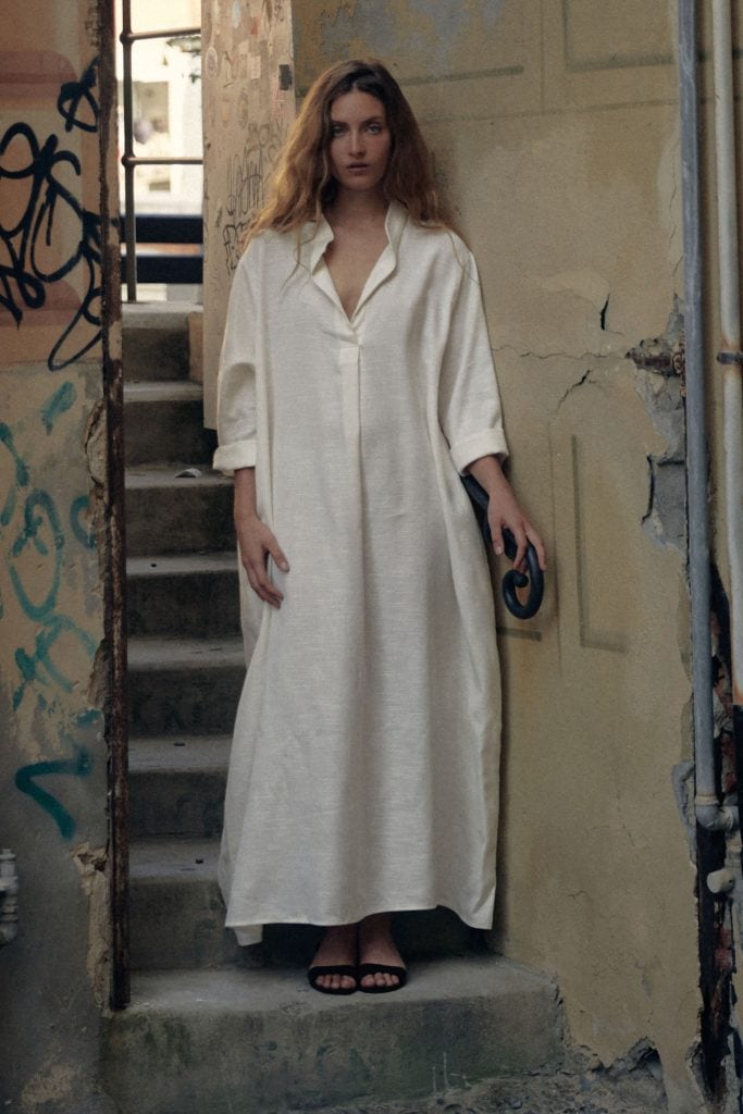 Ergänzt werden die Strickstücke durch gewebte Stoffe aus natürlichen Materialien wie Baumwolle, Seide, Organza oder Musselin, die überwiegend in Deutschland gefertigt werden. Die Kombination aus mongolischem Kaschmir und europäischen Stoffqualitäten spiegelt eine Arbeitsweise wider, die handwerkliche Tradition mit zeitgenössischem Design verbindet.