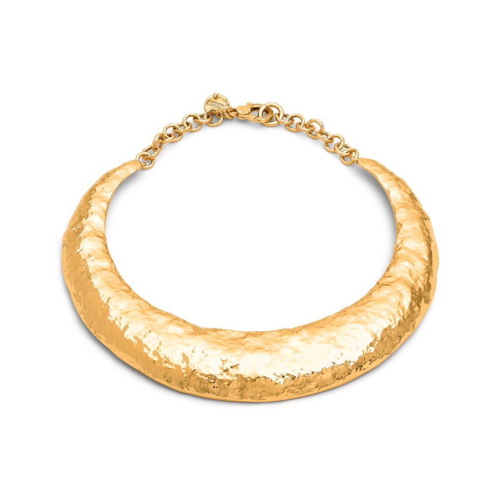 Die Kollektion gliedert sich in drei gestalterische Welten. Die erste konzentriert sich auf feste, skulpturale Formen: Armreifen, Halsketten, Ohrringe, die wie zeitlose Relikte wirken. Texturen erzählen von Transformation, von Hitze, von der Geduld des Materials. Die zweite Welt verbindet Natursteine mit Münzen und gehämmerten Kugeln zu ausdrucksstarken Kompositionen. Hier entstehen Kontraste, die das Auge fordern: die Tiefe des Lapislazuli neben strukturiertem Gold, die transluzente Klarheit von Bergkristall im Zusammenspiel mit warmem Metall. Jede Kombination wirkt wie ein Fundstück aus einer imaginären Reise.